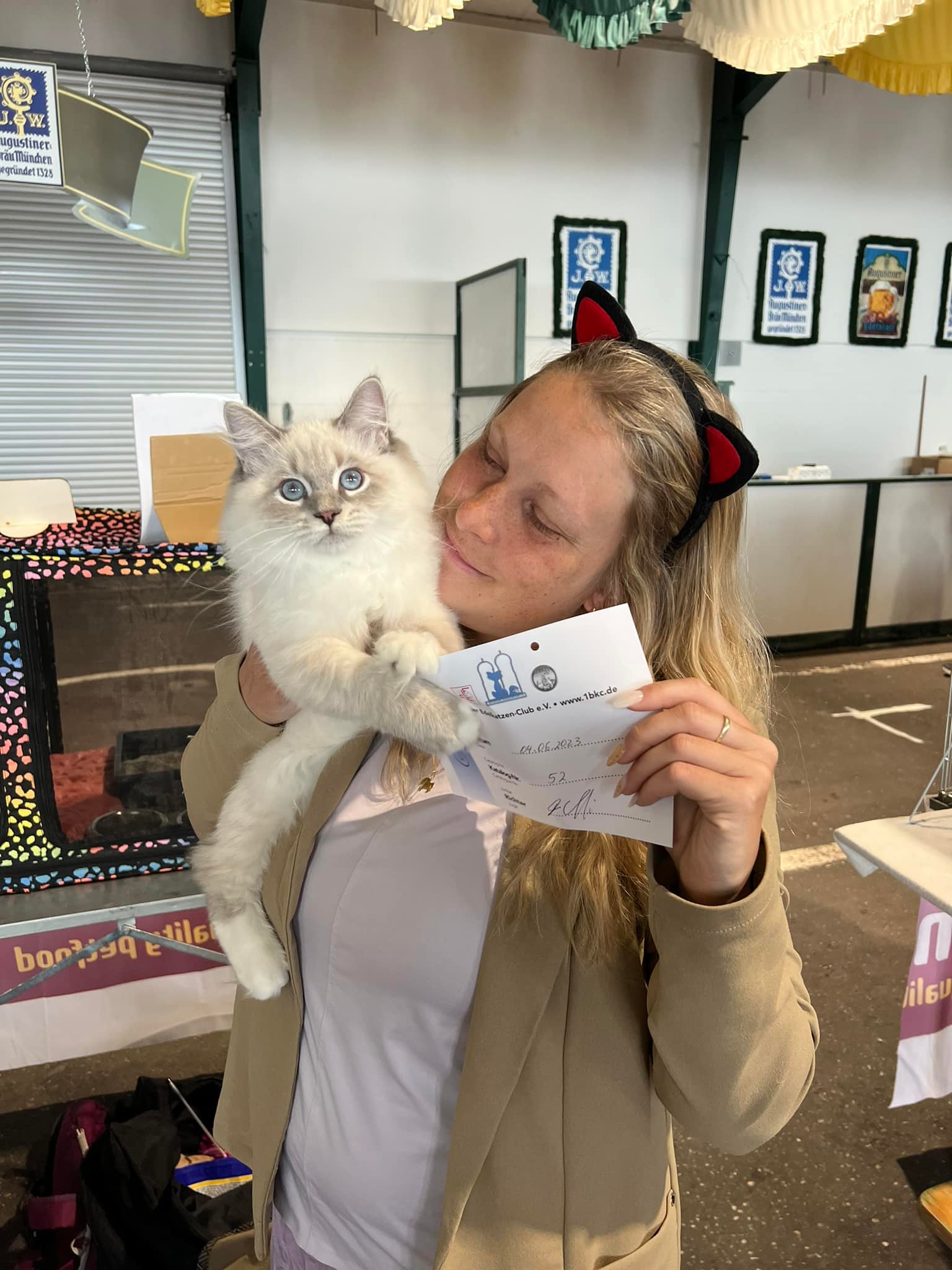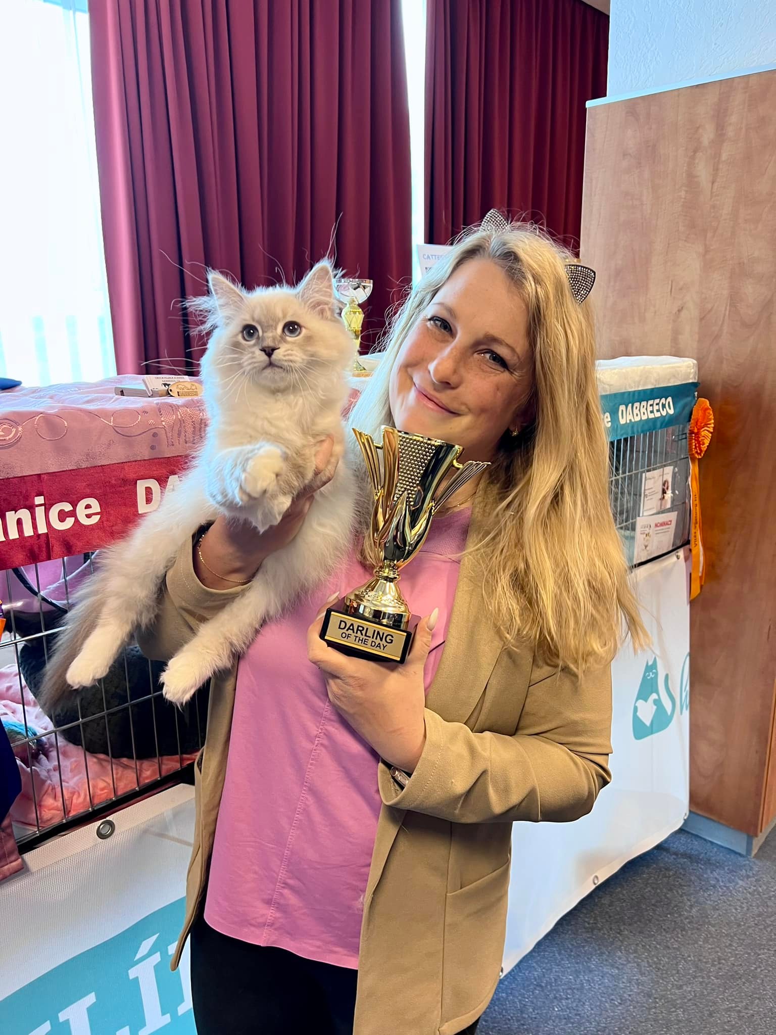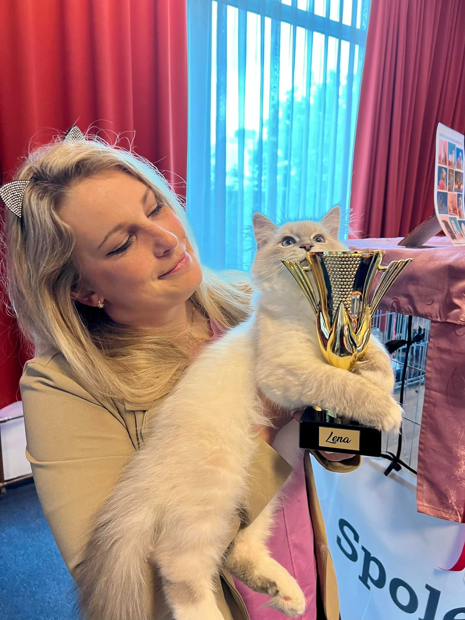 Rádi bychom Vám představili naší královnu nezapomenutelnou “Luninku”. Výjimečná kočička z naší početné smečky, která je nejstarší z našich chovných kočiček. Je to velice klidná a extrémně mazlivá kočička. S velkým potenciálem na felinoterapii a s chutí se zavděčit člověku, včetně pravidelné praxe v zařízení s dětmi, seniory i mentálně postiženými klienty. Na výstavách získala nespočet ocenění a stejně tak splnila podmínky pro 2. nejvyšší titul Grand Inter Champion a po mateřské máme v plánu dojet i Supreme Championa. Dobře prověřená v chovu, valná většina potomků vyšetřených s nejlepšími zdravotními výsledky a povahově vhodnými na felinoterapie. Jeho potomci se neztrácí ani na výstavním poli.