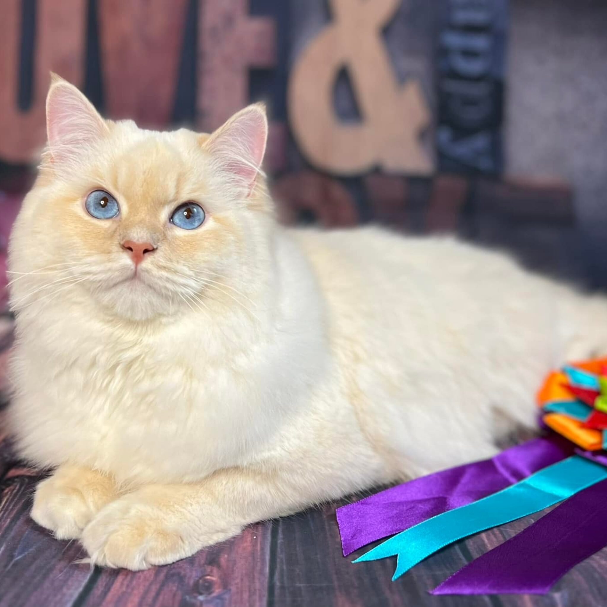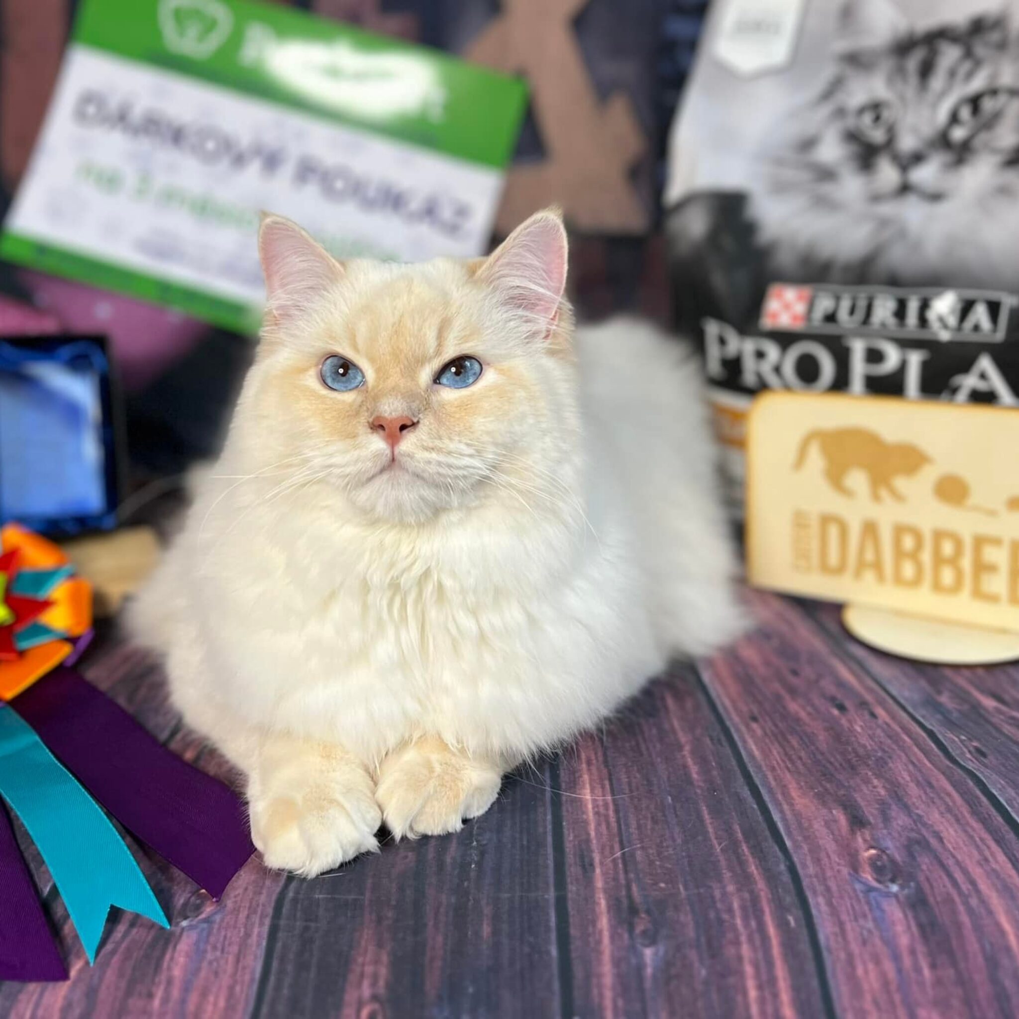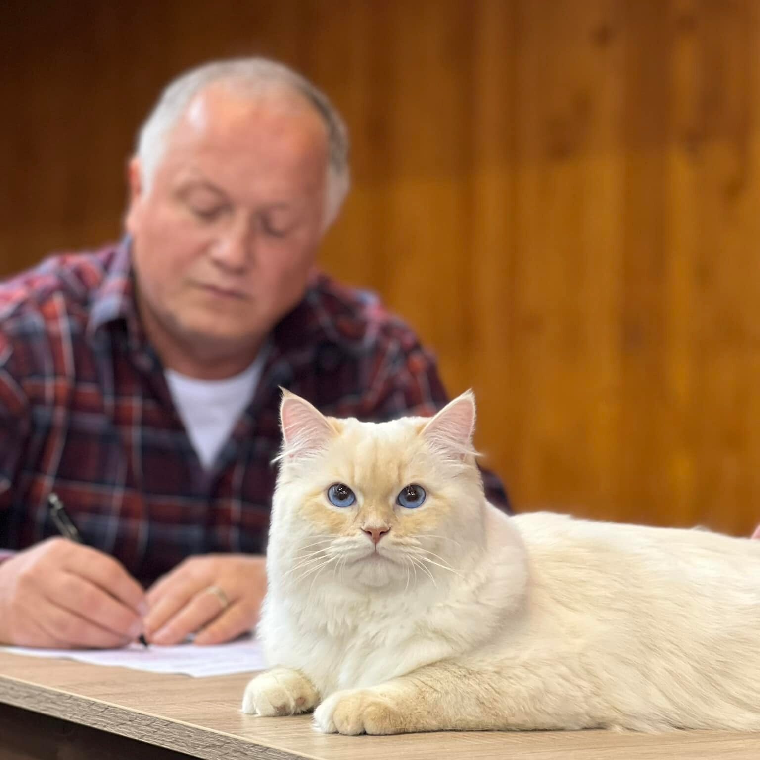 Rádi bychom Vám představili naše modroočko “Orionka”. Nynější kápo naší početné smečky, který udává tempo a za každou cenu musí být slyšet. Je to velice klidný a extrémně mazlivý kocourek. S velkým potenciálem na felinoterapii a s chutí se zavděčit člověku, včetně pravidelné praxe v zařízení s dětmi, seniory i mentálně postiženými klienty. Na výstavách získal mnoho ocenění a stejně tak splnil podmínky i pro nejvyšší titul Supreme Champion. Spolehlivý krycí kocour, zvládá i problémovější kočičky. Dobře prověřený v chovu, valná většina potomků vyšetřených s nejlepšími zdravotními výsledky a povahově vhodnými na felinoterapie. Jeho potomci se neztrácí ani na výstavním poli.
