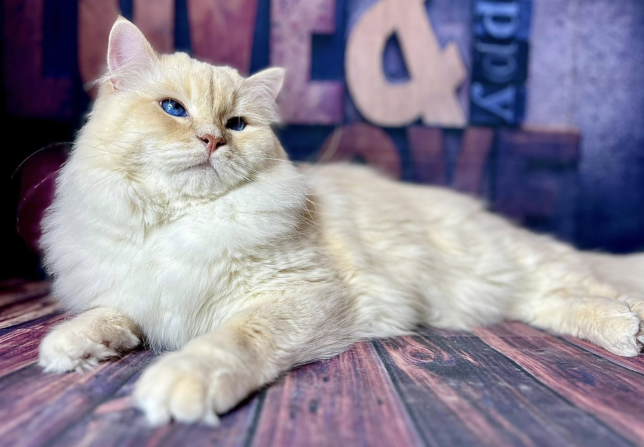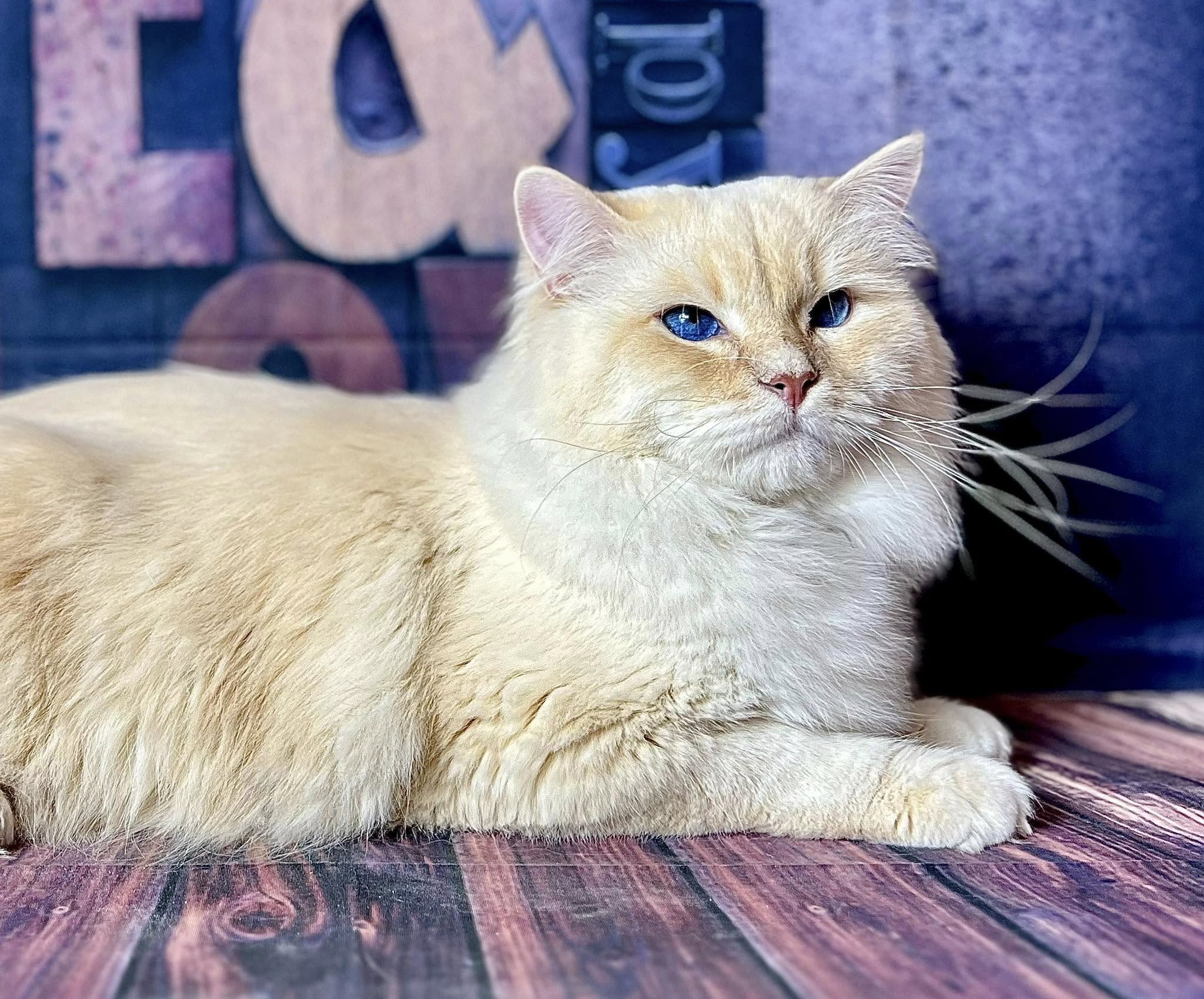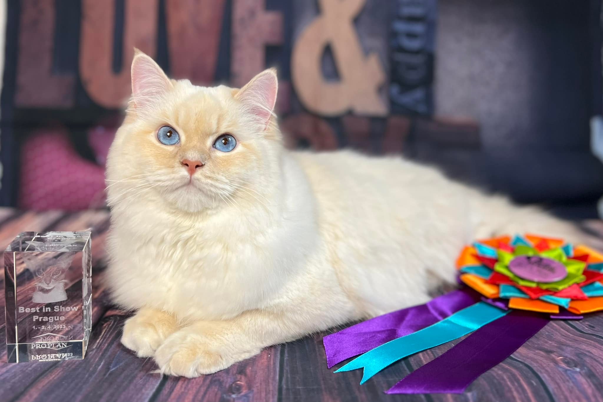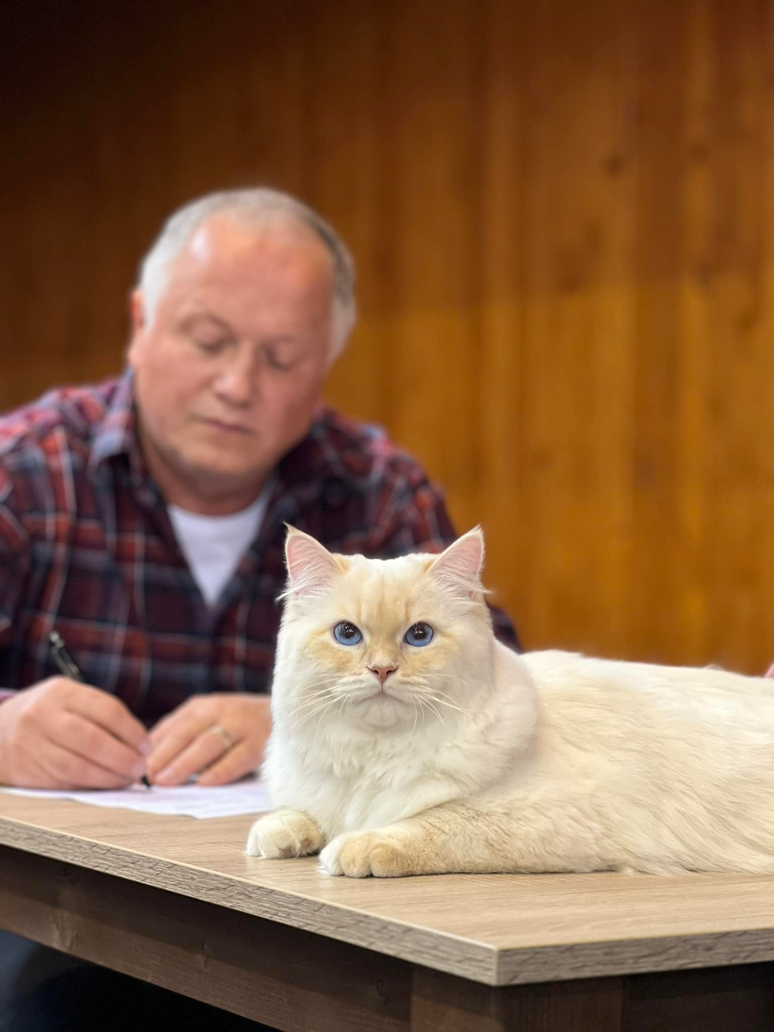 Rádi bychom Vám představili naše modroočko “Orionka”. Nynější kápo naší početné smečky, který udává tempo a za každou cenu musí být slyšet. Je to velice klidný a extrémně mazlivý kocourek. S velkým potenciálem na felinoterapii a s chutí se zavděčit člověku, včetně pravidelné praxe v zařízení s dětmi, seniory i mentálně postiženými klienty. Na výstavách získal mnoho ocenění a stejně tak splnil podmínky i pro nejvyšší titul Supreme Champion. Spolehlivý krycí kocour, zvládá i problémovější kočičky. Dobře prověřený v chovu, valná většina potomků vyšetřených s nejlepšími zdravotními výsledky a povahově vhodnými na felinoterapie. Jeho potomci se neztrácí ani na výstavním poli.